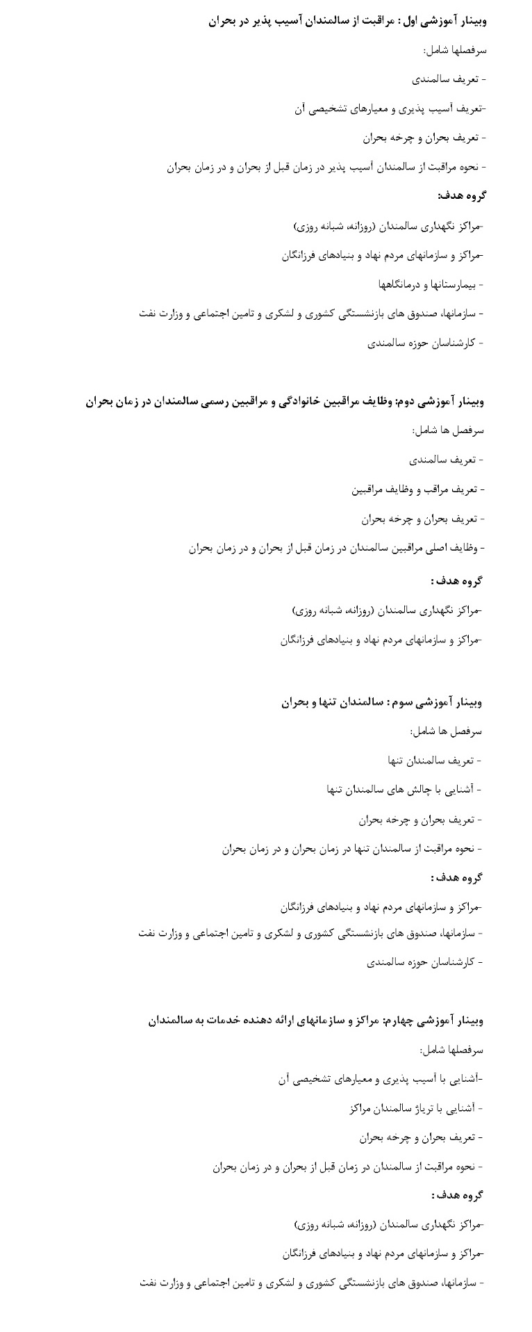 برگزاری سلسله وبینار آموزشی جهت ارتقاء مهارت متخصصان حوزه سلامتی سالمندی در دوران جنگ تحمیلی